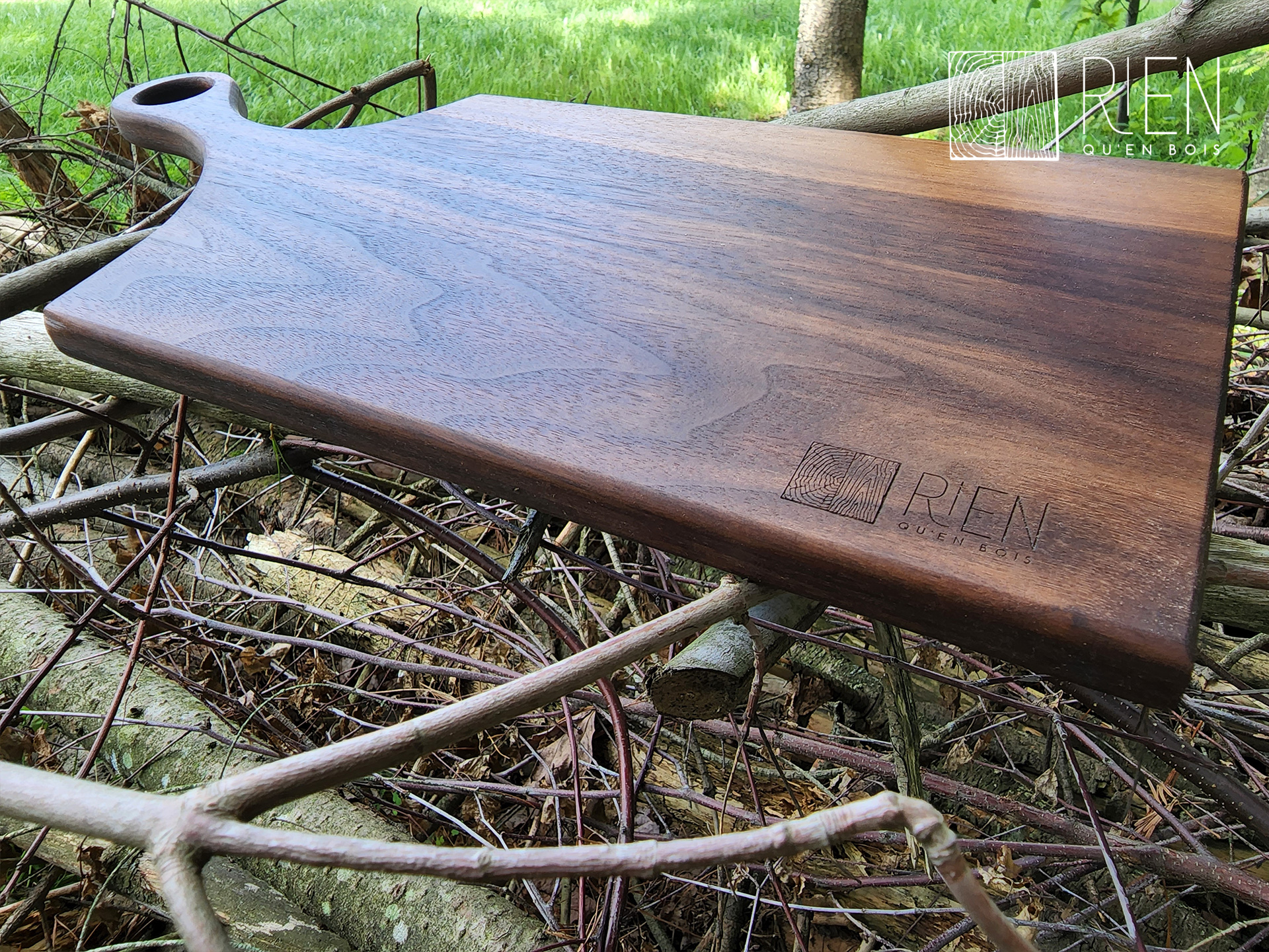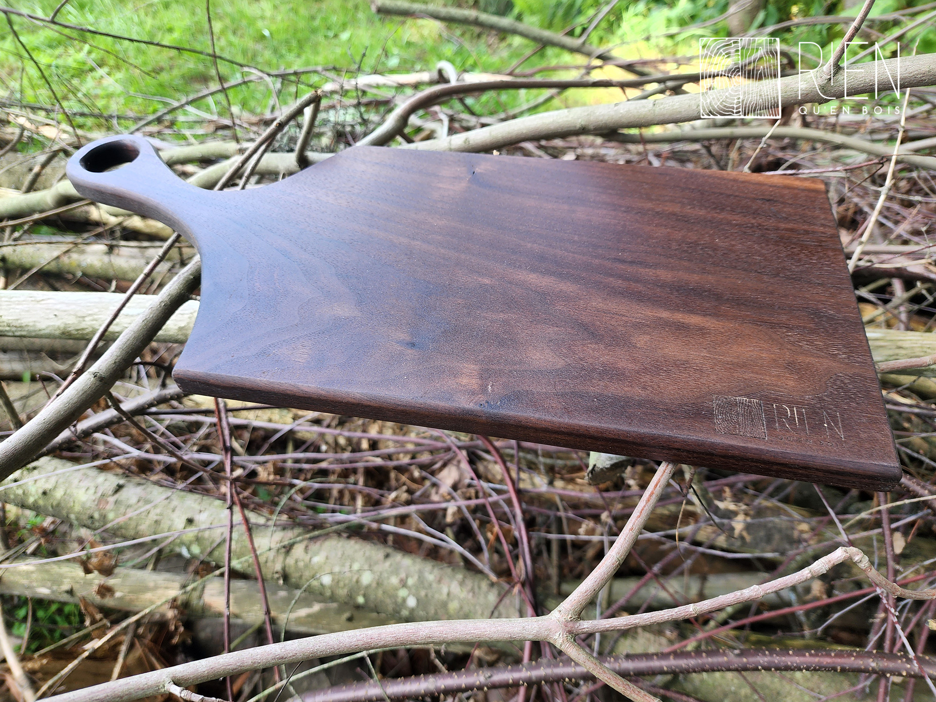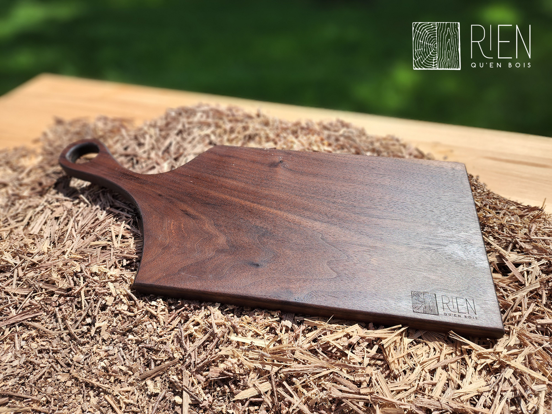 Planche de charcuterie en bois de face, en noyer noir, mesurant 18 1/8 po x 7 5/8 po x 3/4 po.