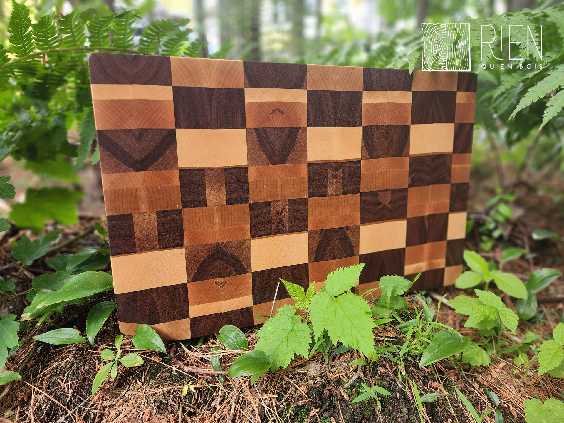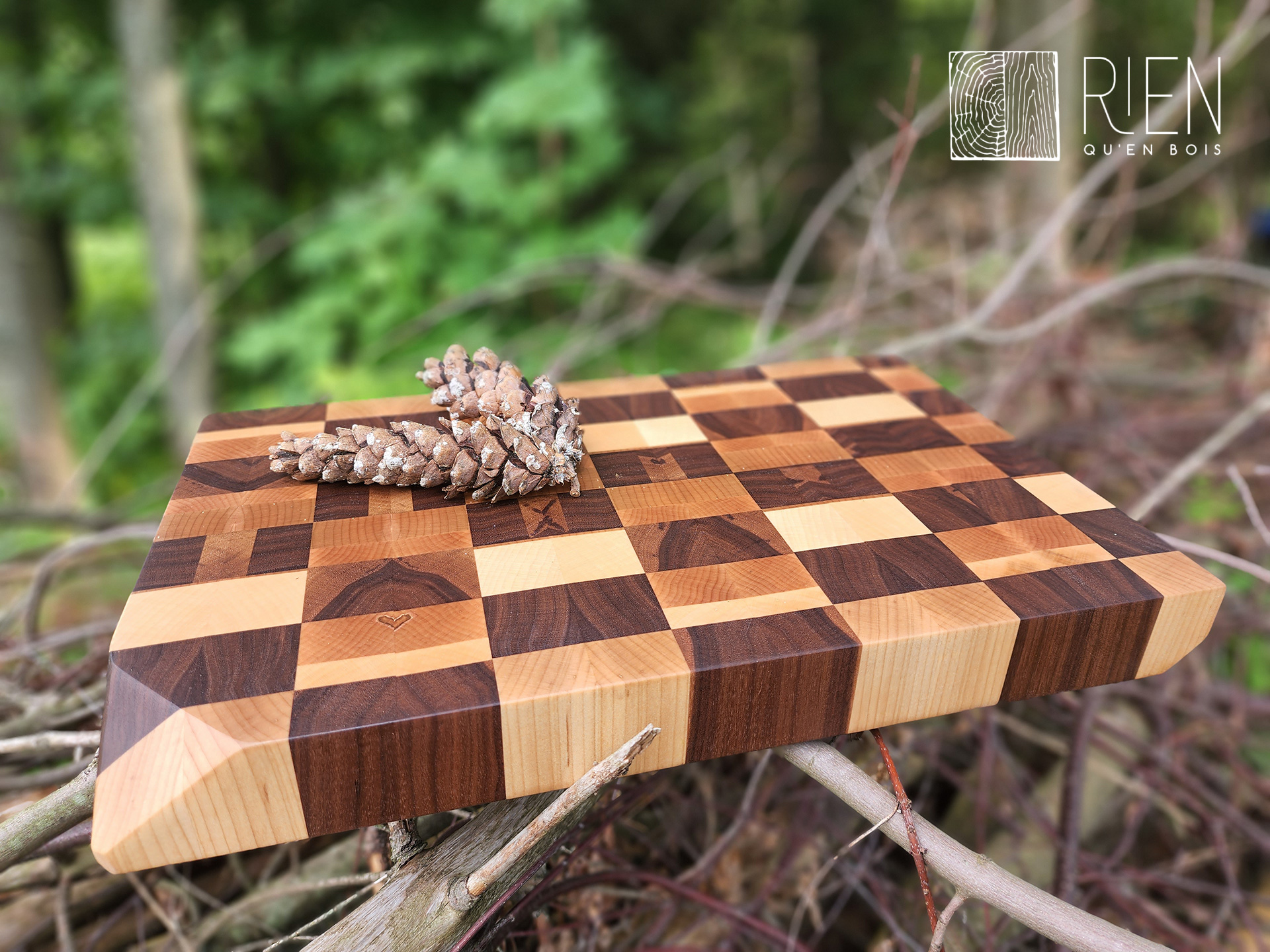 Planche en bois debout, en érable et noyer noir, mesurant 16 po x 11 1/8 po x 1 1/4 po.